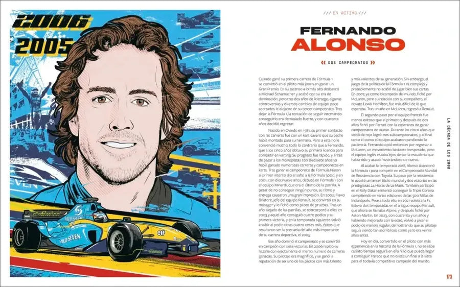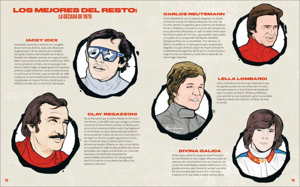 - Biografías de más 40 pilotos famosos, como Giuseppe Farina, el primer campeón mundial, Fernando Alonso, Lewis Hamilton o el actual campeón Max Verstappen.