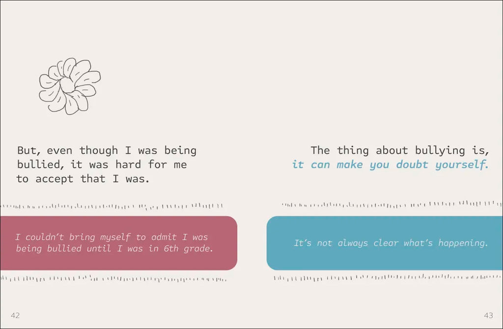 This is a kid's book about bullying. It explores the impacts of bullying and helps kids to identify when bullying is taking place, as well as encouraging empathy and offering a path forward for children who have felt its effects.