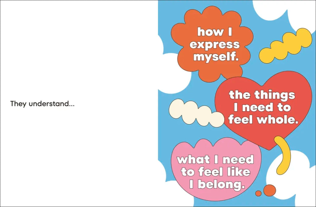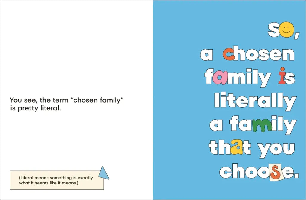 This book was made to help kids aged 5-9 understand what a chosen family is and how they work. At its core, a chosen family is made up of people who love, see, and support you for being your truest self. Chosen family looks unique to each of us, but they should all make us feel safe and supported!