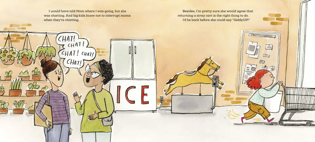 But who likes going to the grocery store? Especially with Moms who always say “no” to sugar cereals and don’t let you ride in the cart. But for one little kid, the perfect opportunity rolls by when Mom is busy chatting with neighbors. It turns out, the store isn’t boring AT ALL if you’re the one pushing the cart! But where are the bananas? And what happens when you find yourself IN the cart, hurtling down an aisle at full speed??