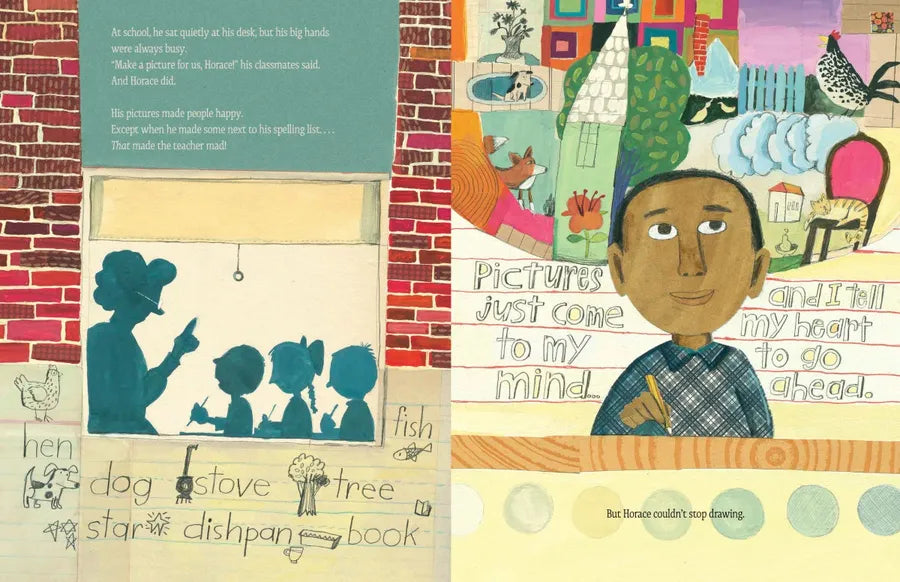 As a child in the late 1800s, Horace Pippin loved to draw: He loved the feel of the charcoal as it slid across the floor. He loved looking at something in the room and making it come alive again in front of him. He drew pictures for his sisters, his classmates, his co-workers. Even during W.W.I, Horace filled his notebooks with drawings from the trenches . . . until he was shot. Upon his return home, Horace couldn't lift his right arm, and couldn't make any art. Slowly, with lots of practice, he regained use of his arm, until once again, he was able to paint--and paint, and paint! Soon, people—including the famous painter N. C. Wyeth—started noticing Horace's art, and before long, his paintings were displayed in galleries and museums across the country.