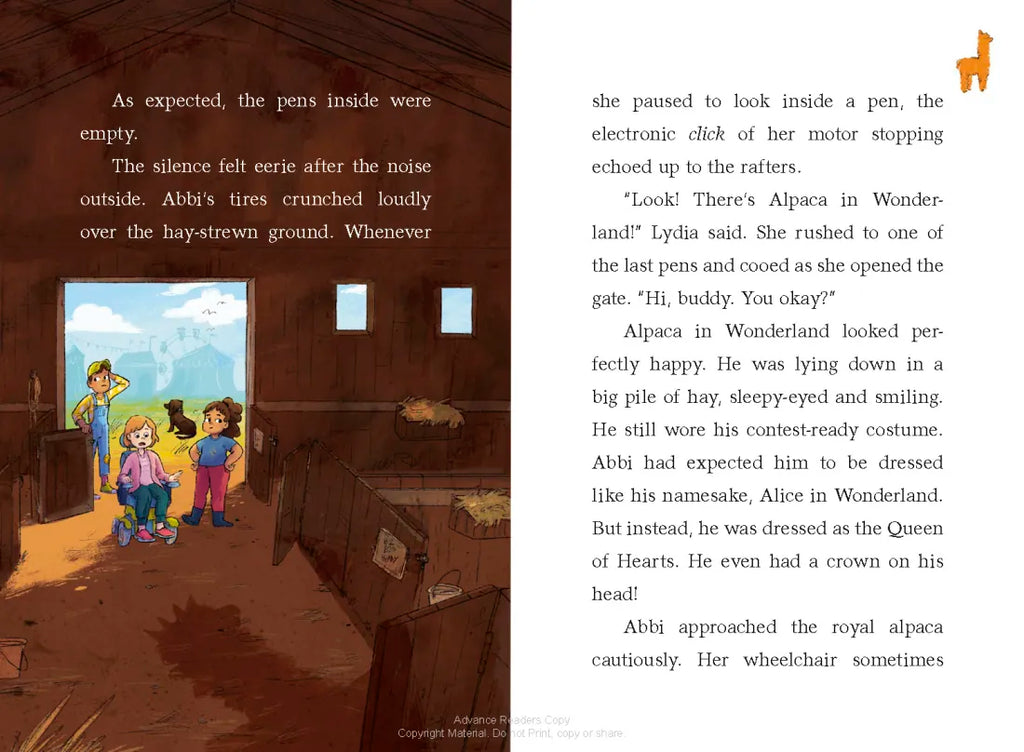 It's time for the alpaca costume contest, and Abigail "Abbi" Wallace is excited to see it at the Maine State Fair. But there’s only one alpaca left—the rest are missing! What sent the alpacas packing? Abbi; her dog, Barkley; and her friends Lydia and Daniel are ready to sniff out this mystery!
