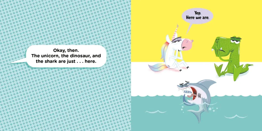 Absurdity abounds in this funny picture book that tries to tell the tale of a unicorn, a dinosaur, and a shark.