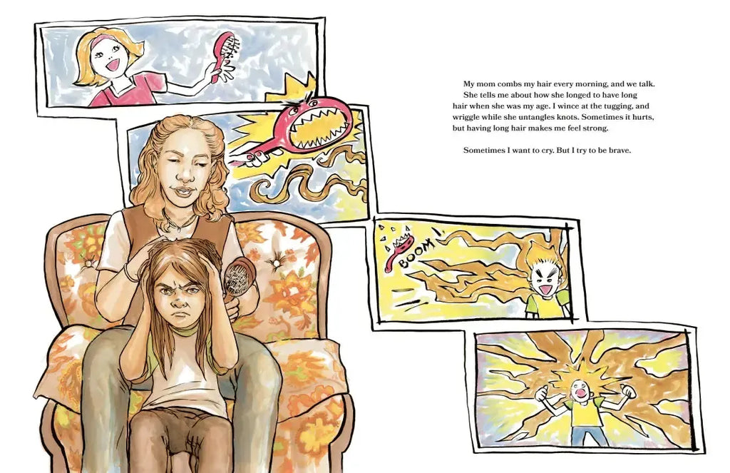 Each morning, Dad brushes the knots from his son’s long hair to braid it. The boy winces at the tugging, and at school he's teased for his braid. But he remembers the stories of how his father and grandpa were forced to cut their hair and forbidden from practicing their traditions when they were young, and how they fought to make it possible for him to wear his hair long. Although it can hurt, having long hair ultimately makes him feel brave and strong.
