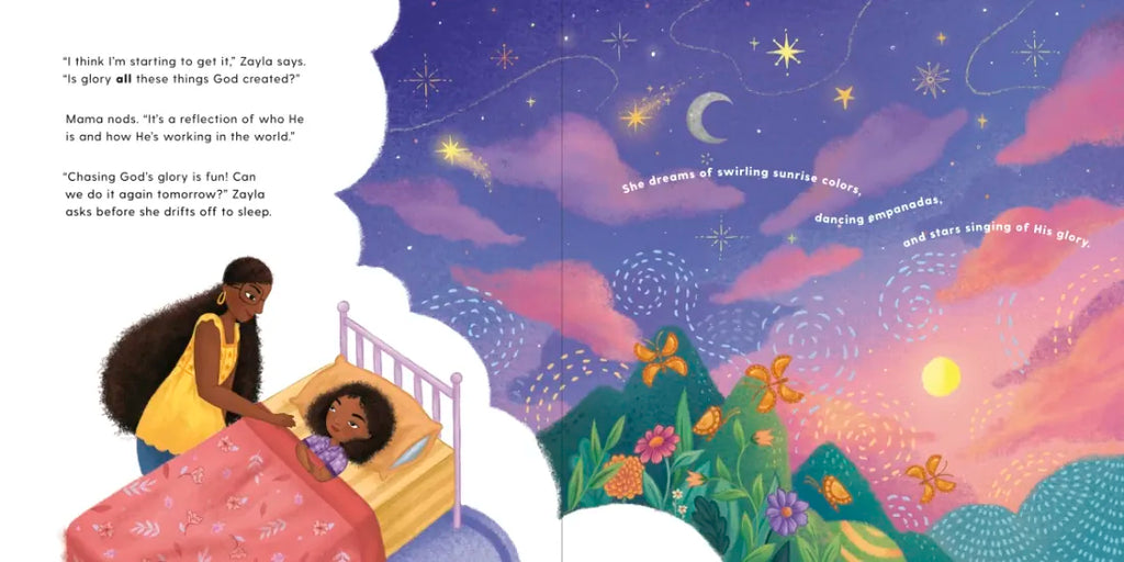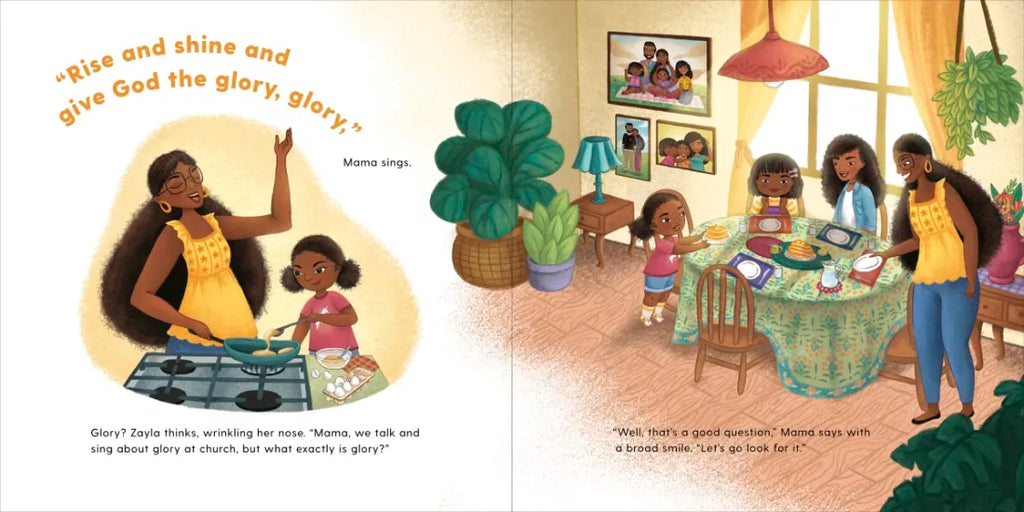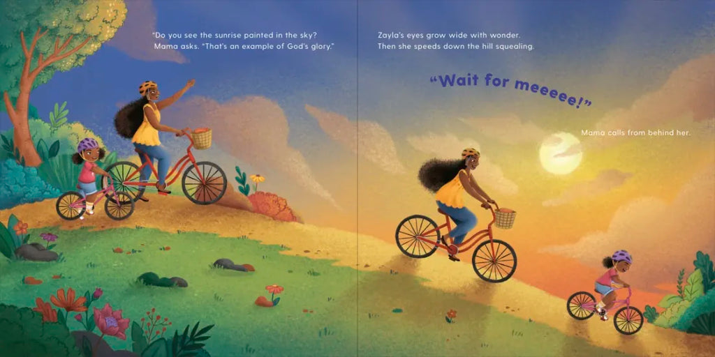 When Zayla asks her mom to describe God’s glory, Mama knows it’s time for an adventure! Together, Mama and Zayla discover how sunrises and dancing, daffodils and green peppers, kind words and loving hugs—and more!—are all reminders of God’s glory.