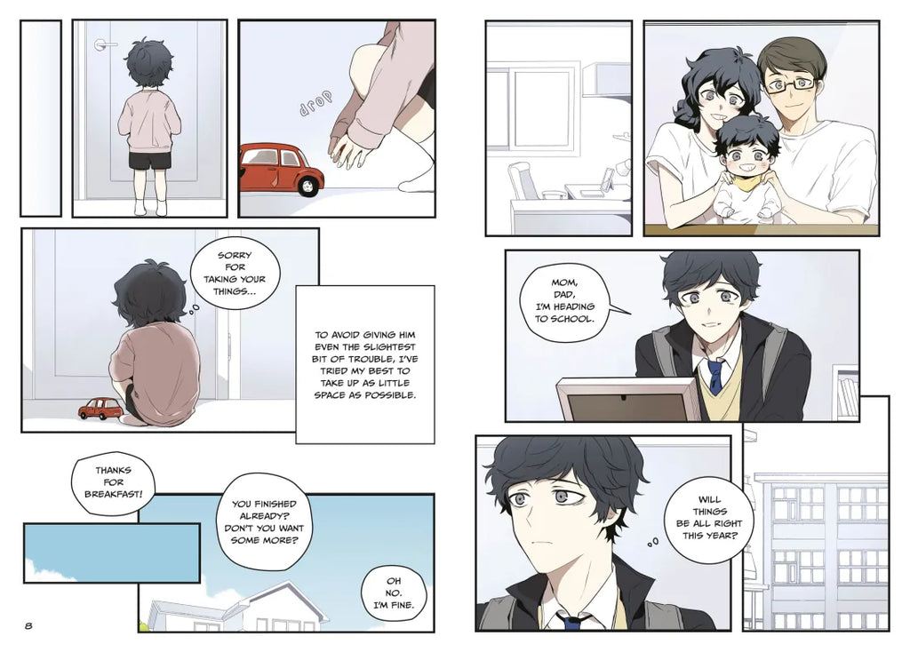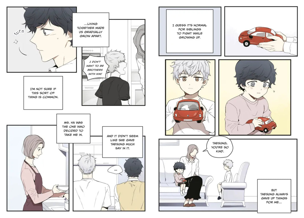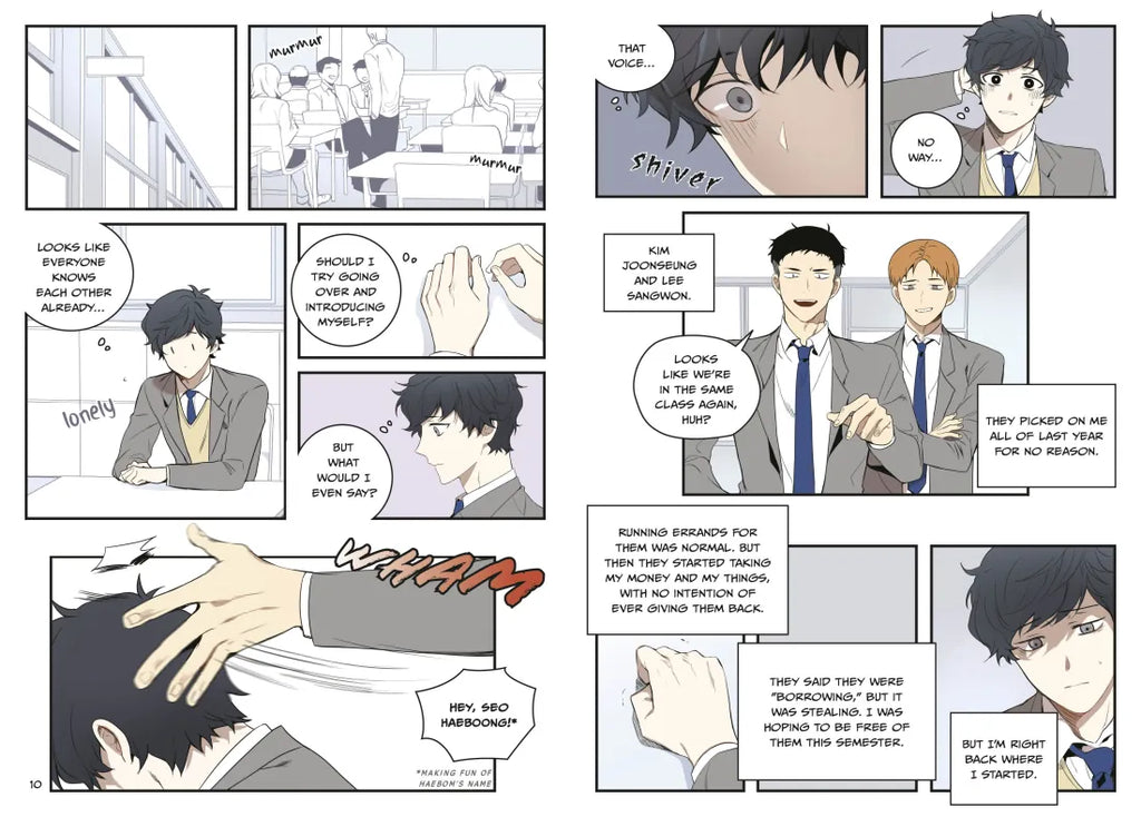 Now it’s their senior year of high school and, after years of barely speaking to each other, Haebom and Taesung are in the same class for the first time. Haebom struggles to make friends and is plagued by bullying, but after the handsome and popular Taesung fends off his most persistent bully, everything changes—they sit together at lunch and begin to act like friends again. Haebom is unsure what to make of the shift, but this could be his last chance to mend their relationship.