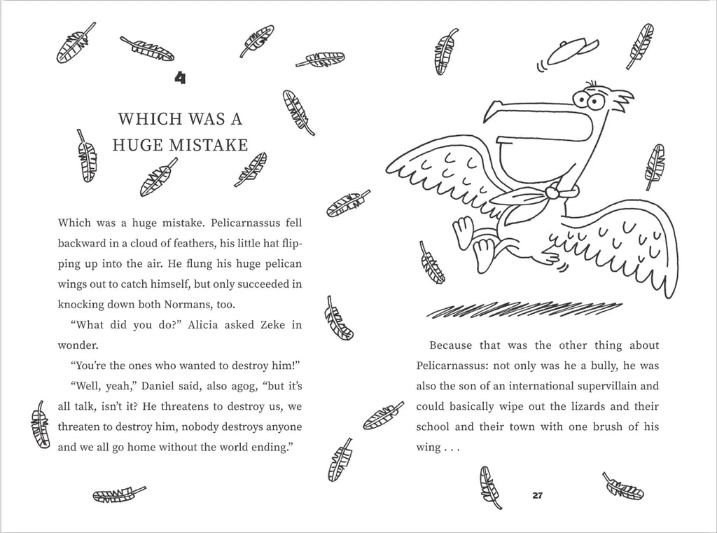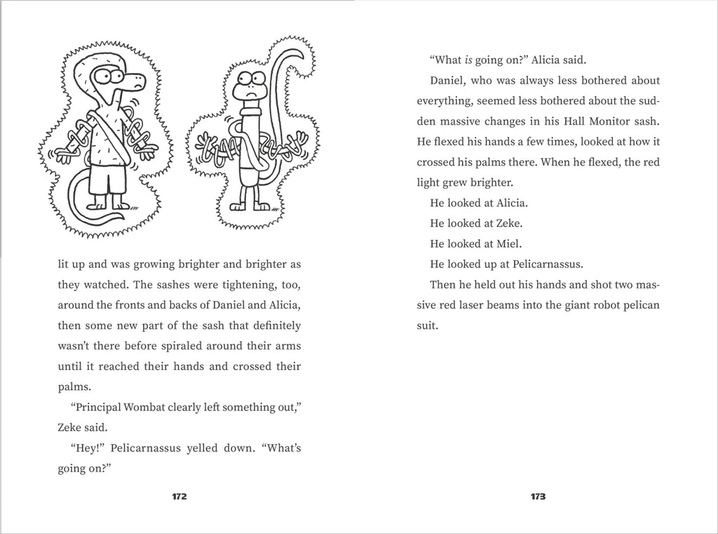When Principal Wombat makes monitor lizards Zeke, Daniel, and Alicia hall monitors, Zeke gives up on popularity at his new school. Brought in as part of a district blending program, the monitor lizards were mostly ignored before. Reptiles aren’t bullied any more than other students, but they do stick out among zebras, ostriches, and elk. Why would Principal Wombat make them hall monitors? Alicia explains that it’s because mammals are afraid of being yelled (hissed) at by reptiles. The principal’s just a good general, deploying her resources. Zeke balks, until he gets on the wrong side of Pelicarnassus. More than a bully, the pelican is a famed international supervillain—at least when his mother isn’t looking. Maybe the halls are a war zone, and the school needs a hero. Too bad it isn’t . . . Zeke. Smart, relatable, and densely illustrated in black and white for graphic appeal, this middle-grade series debut by a revered author returns to his themes of grief, bullying, and negotiating differences—but with zeal and comic relief to spare.