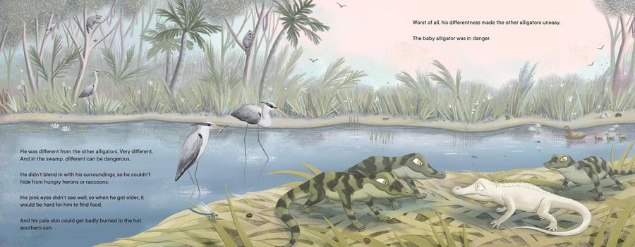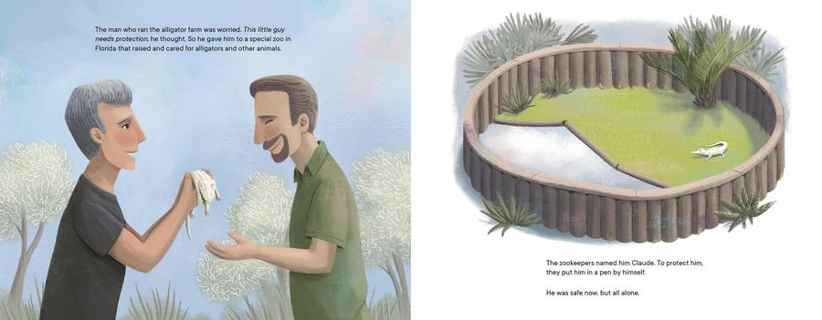 Claude is a celebrity alligator and the mascot for San Francisco's California Academy of Sciences. His story started almost 25 years ago in Louisiana, where he hatched out of his egg to discover he looked different from the other hatchlings. They were green and Claude was white. The other hatchings avoided him, and his color made him vulnerable to predators. So Claude went to a special zoo that cared for alligators where he lived in a pen by himself. Now he was safe--but alone.