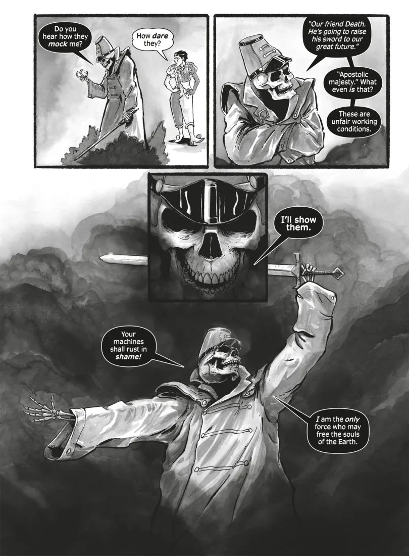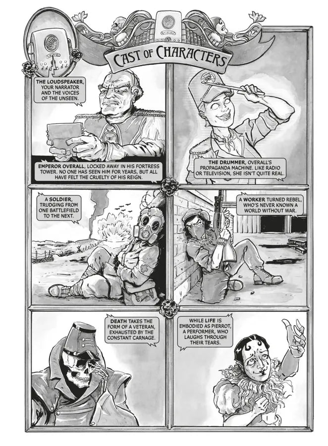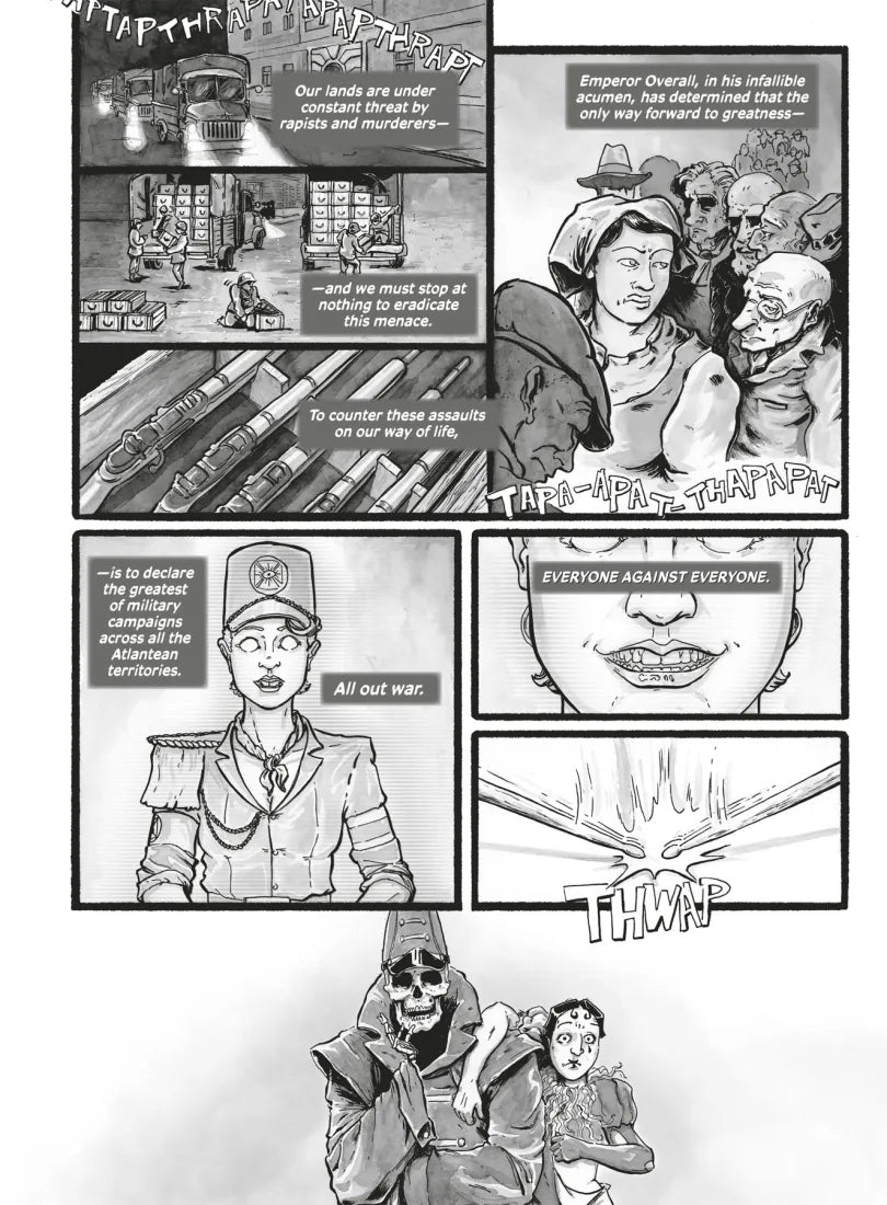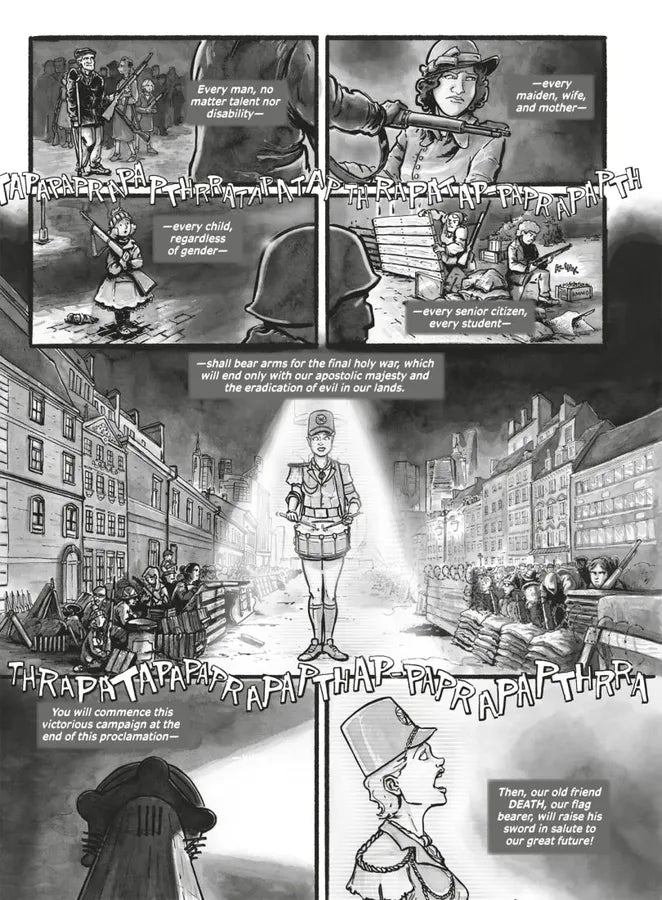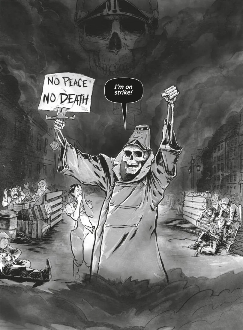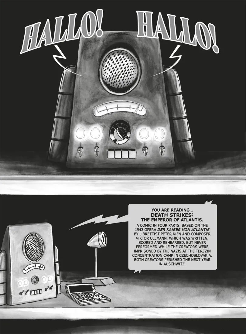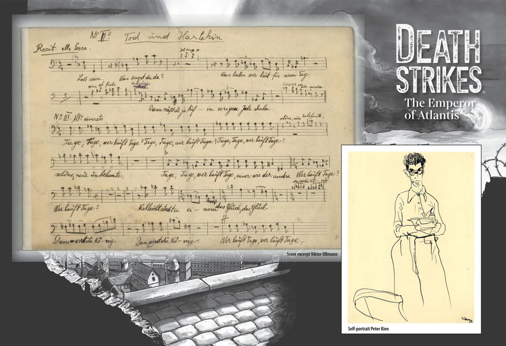 Mixing dystopian sci-fi, mythic fantasy, and zombie horror, Death Strikes: The Emperor of Atlantis, is a graphic novel based on a suppressed opera written in 1943 by Peter Kien and Viktor Ullmann, two prisoners at the Terezín concentration camp in Czechoslovakia. The authors did not live to see their masterpiece performed.