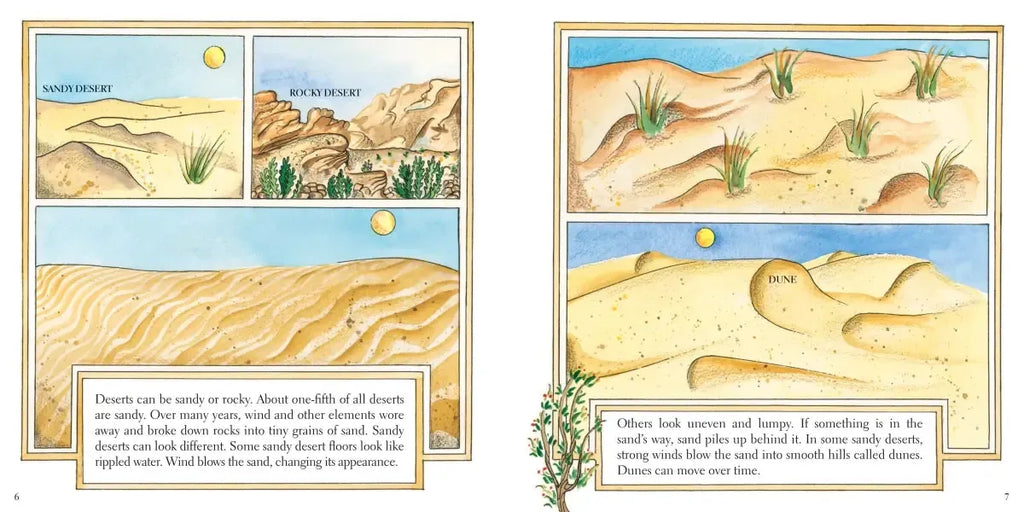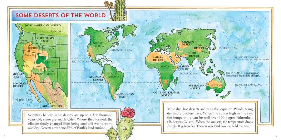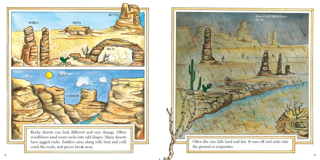 Learn about the different types of terrain found in deserts from dunes to mesas. With accessible diagrams, learn how succulents and other plants survive such a dry, hot climate. Meet the birds, critters, and creepy crawlies that call the desert home. Clearly labeled watercolor illustrations introduce young readers to dozens of desert dwellers from the western diamondback rattlesnake to the road runner to the camel.
