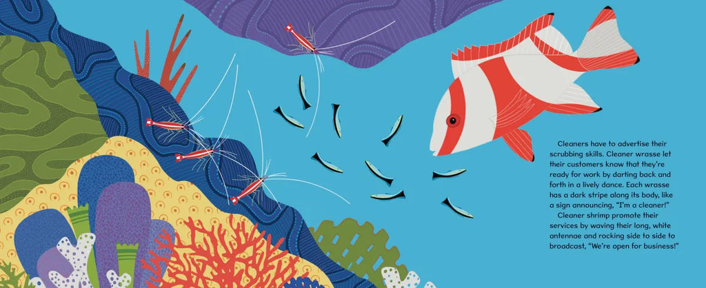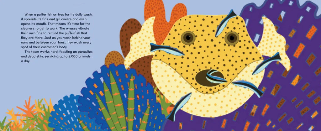 Cleaners remove pesky parasites from their customers in return for a tasty meal, serving up to 2000 customers a day. Sea turtles, manta rays, and even sharks line up for a scrubbing in the busy stations, just like at a car wash. Some customers return 100 times daily. And they must remember the important rule if they want a washing by the cleaning crew: DON’T EAT THE CLEANERS!