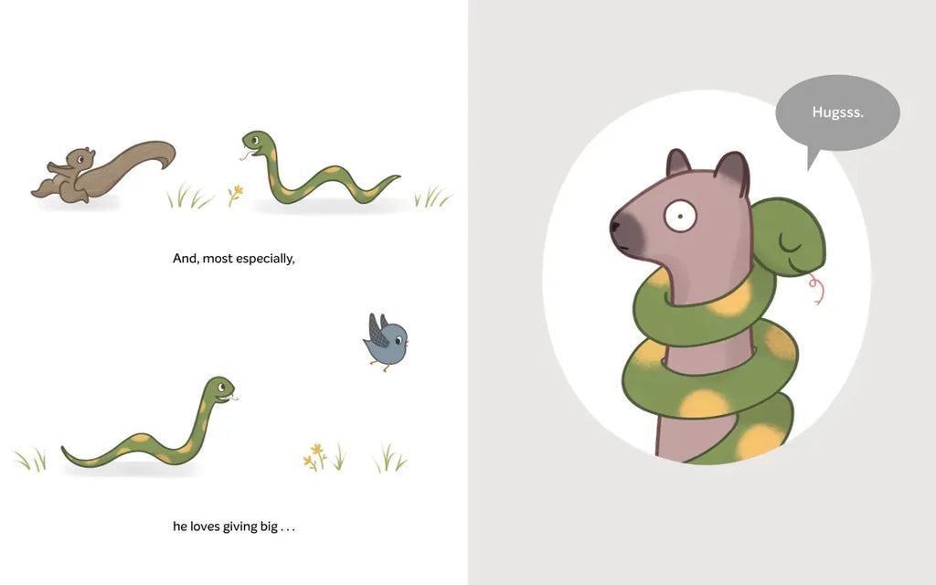 Drake is a very friendly snake, who loves to play with his friends, but he can be a little over-eager and disruptive when he joins in their play. He also loves to give big hugs, but he doesn’t always ask first, and his friends don’t always like to be hugged.