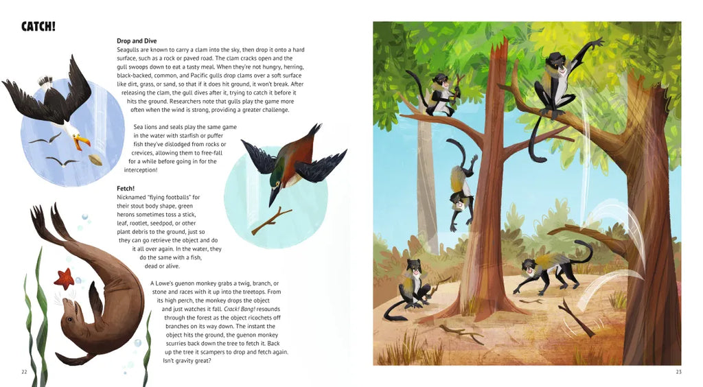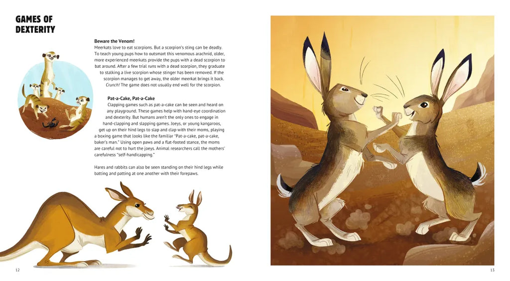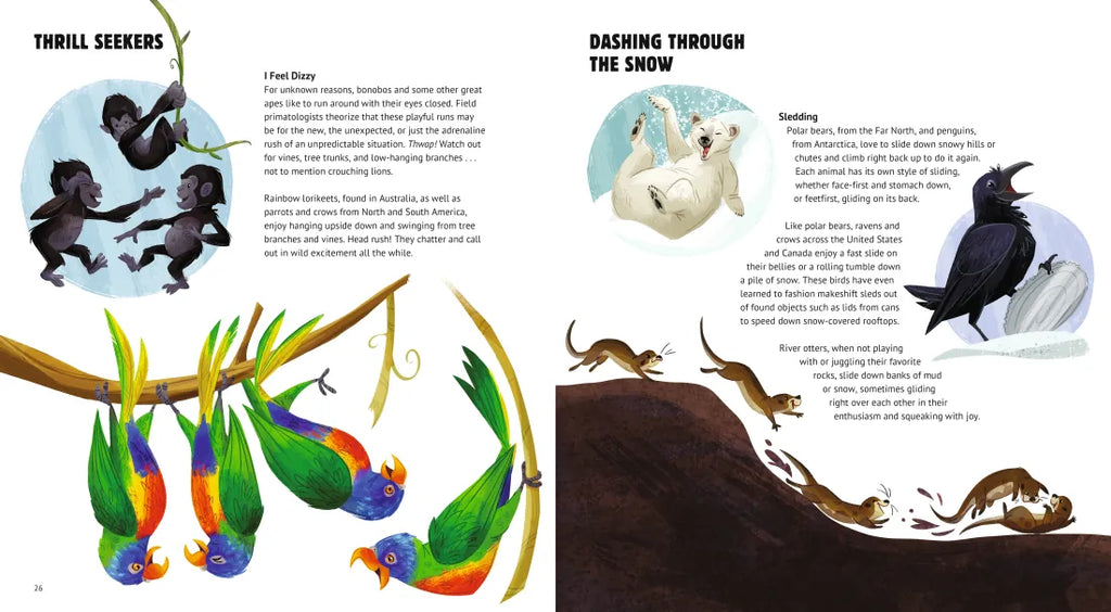 Step into the fascinating world of animal playtime to find penguins surfing for the joy of it, primates playing peekaboo, and sneaky keas—the pranksters of the bird world—yanking one another’s legs just for kicks. Creatures of all stripes like to play! Some play builds strength and teaches survival skills: a game of tug-of-war prepares wolf cubs for hunting and taking down prey, while games of hide-and-seek give mongooses practice at quick escapes, handy for outmaneuvering predators. Some games appear to be played simply for enjoyment: Polar bears love to slide down snowy hills, then climb back up and do it again. Gorilla parents swing, hug, and give bouncy rides to their children. And elephants have been known to lie in wait for a companion to come strolling along, then—BAROOM!—roll downhill to bowl them over like a friendly ball. Join Richard Haynes and Stephanie Laberis, creators of Orangutan Hats and Other Tools Animals Use, for another illuminating walk on the wild side. Scientific observations from the natural world, a glossary, and a bibliography combine with colorful and vivacious illustrations to make this guide an extra fun look at—fun!