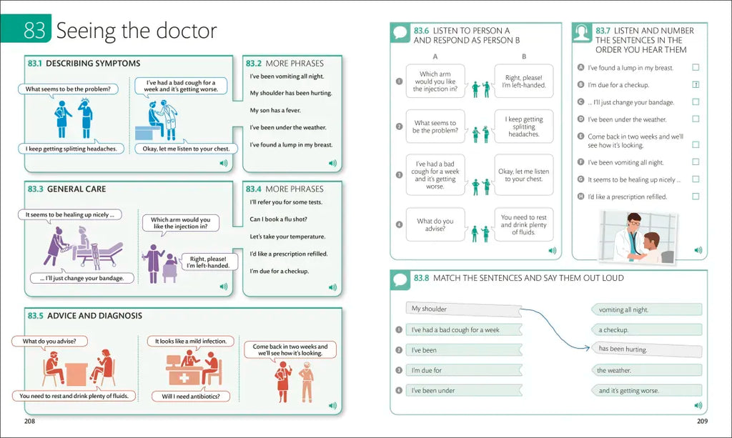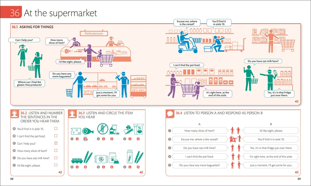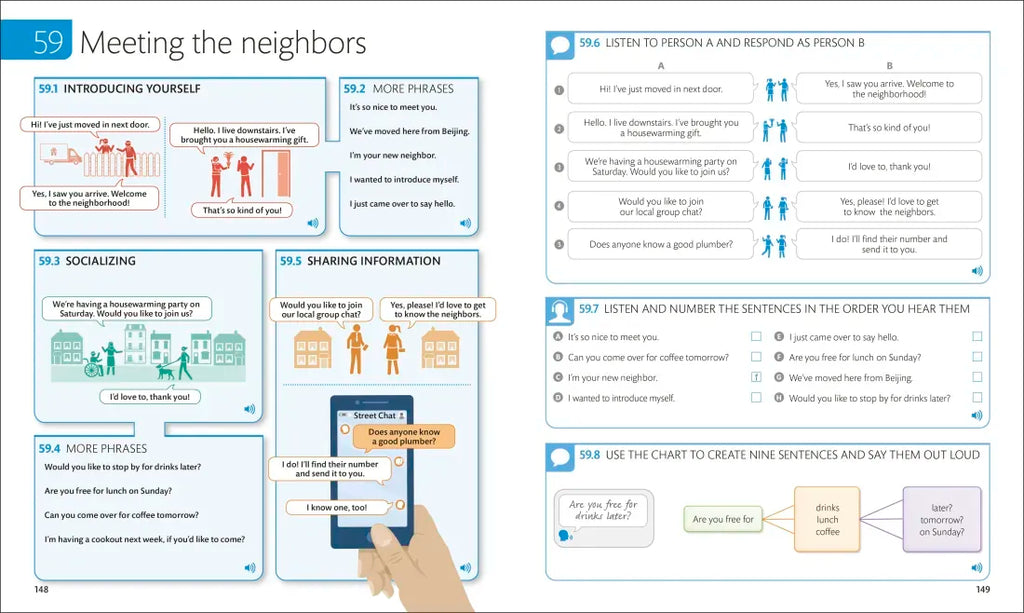 This engaging and accessible book covers a wide range of real-life topics and scenarios – from everyday activities, such as going to the supermarket and making appointments, to key communication skills, such as comforting someone and dealing with conflict. You’ll learn how to welcome visitors, ask for directions, give a presentation at work, find somewhere to live, order a meal out, and much, much more.