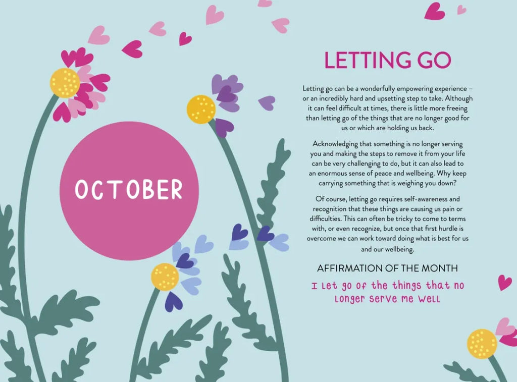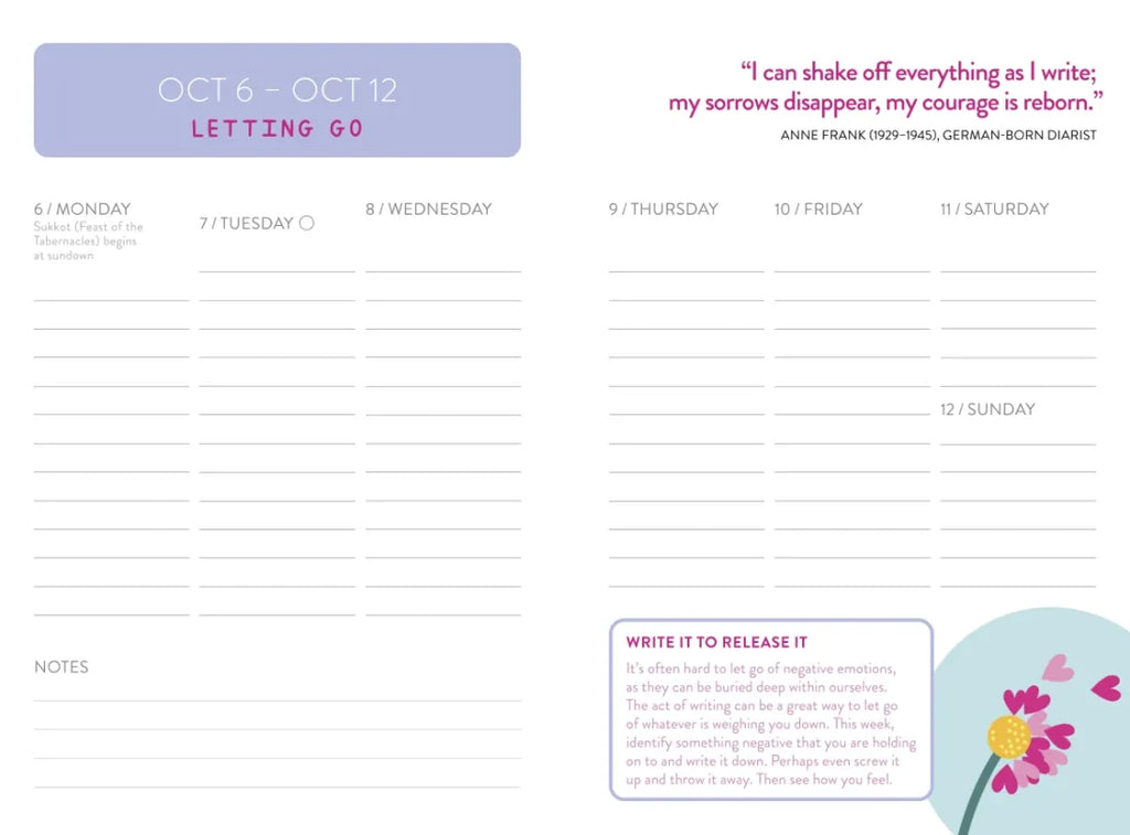 Focusing on just one theme for each month, but in a different way each week, allows a seed of inspiration and awareness not just to be planted but also to grow substantially, so that positive action can become an integral part of daily life. Each week-to-view spread features an inspiring quote that encourages reflection on the month's theme and an exercise to further your overall wellbeing.