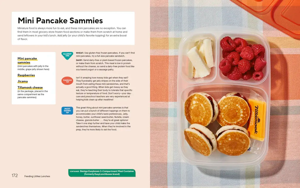 Feeding Littles Lunches also includes a lunch packing formula to help you plan your own lunches, grocery lists, tips for dealing with cafeteria and school settings, picky eating, food safety, and more! With creative and approachable lunches like Chicken Salad with Mini Brioche Toasts, Sun Butter Banana Roll-Up “Sushi-Style,” Build-Your-Own Naan Pizza, Leftover Burger Mini Sliders, Pesto Turkey Wrap Rounds, and more, you’ll bring joy back to lunchtime.