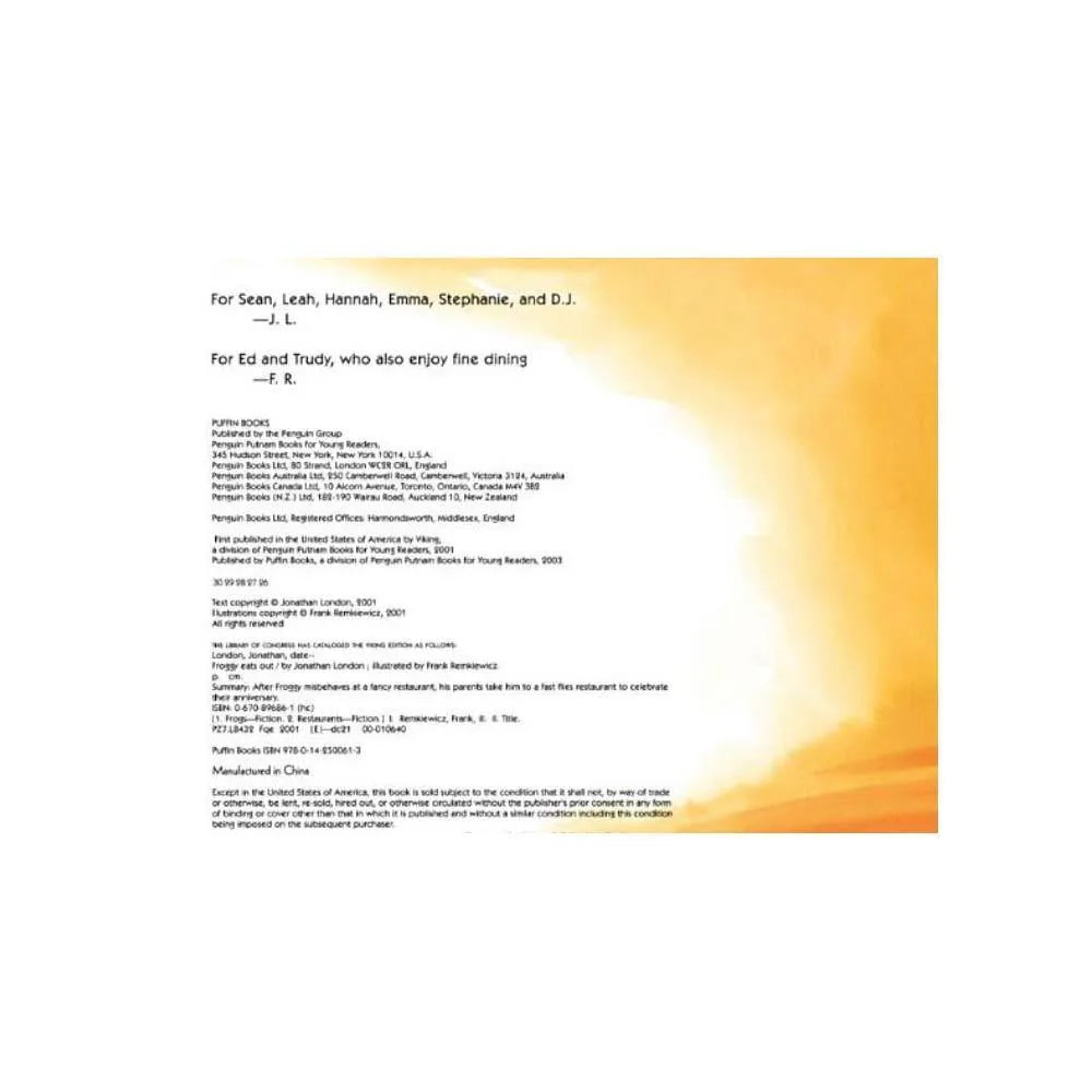 It's a special occasion, so Froggy and his parents are going to eat dinner in a fancy restaurant. When they arrive at the restaurant, Froggy's mom has a few rules for him: "Be neat, be quiet, and don't put your feet on the table." But it's so hard for Froggy to sit still. He fidgets, he squirms, and he sssllluuuurrrrpppps his spaghetti. Then he spots Frogilina across the restaurant-now it's impossible for Froggy to follow the rules!