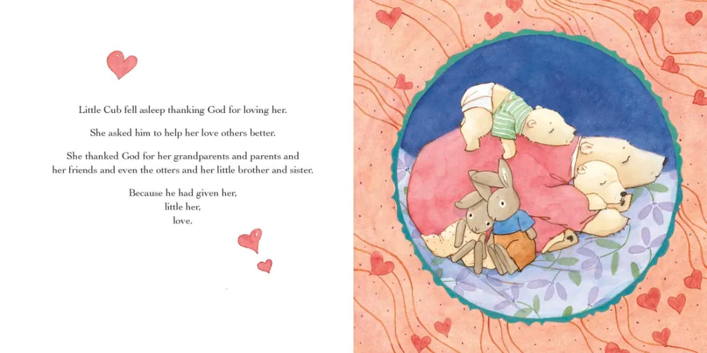 In answering Little Cub’s questions, Grampa Bear gives tender explanations that teach Little Cub about the different kinds of love that is shared between families, friends, and mamas and papas. Grampa explains that all these kinds of love come from God and that it is important to love others because . . .