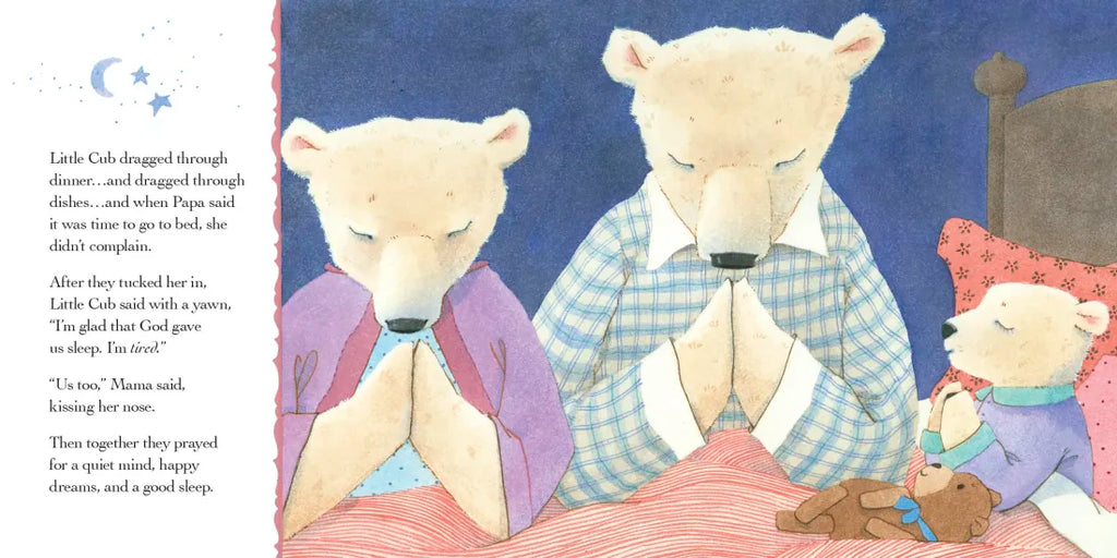 Little Cub is having so much fun building an igloo with her friends that she doesn’t want to stop for bedtime! Who needs sleep when there’s fun to be had? Mama patiently answers her child’s questions as she puts her to bed, explaining the importance of daily rhythms of work, play, and rest. As they talk through the fears that come with nighttime—and work through Little Cub’s endless stalling tactics—our favorite bear learns to realize that God gave us sleep as a vital gift.