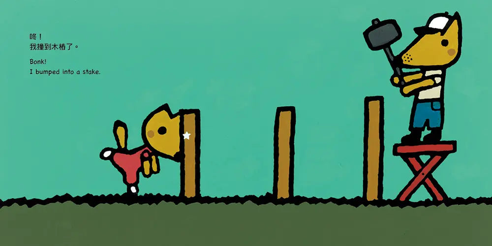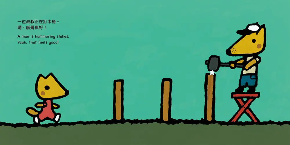 畫面中,走路時的小狐狸看起來神采飛揚,但一不小心「咚!」一聲撞到東西的動作,每每讓人傻眼發笑。親子共讀時,無論是大人親自說故事,或是掃描QR code播放中文版和英文版的故事音檔聆聽,隨著每一頁重複又有韻律的句子:「嗯,感覺真好!/Yeah, that feels good!」、「咚!我撞到了——/Bonk! I bumped into a…」也引導孩子一起開口朗讀、模仿小狐狸的動作,或說出自己的快樂感受和用身體動作表達心情的方式吧!從充滿樂趣的親子互動中,孩子也能學習覺察他人的肢體語言與同理他人的情緒變化。