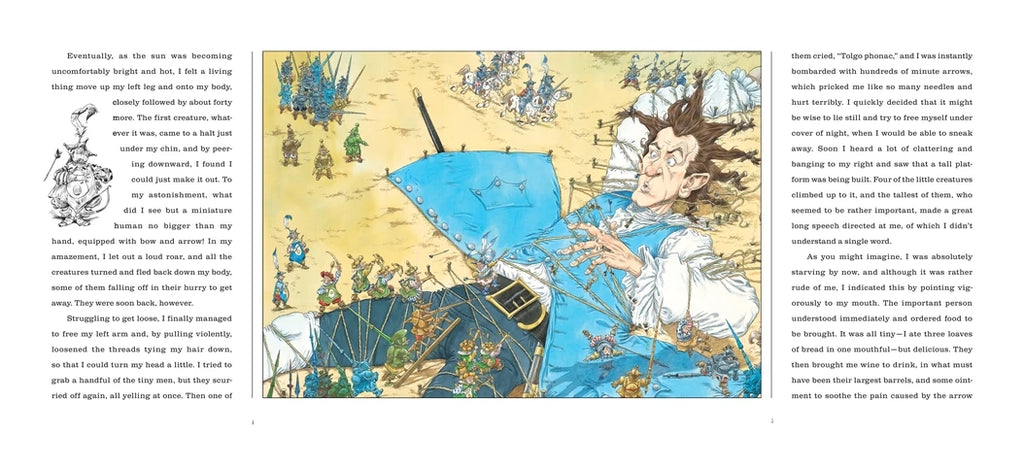 In the best-known tale from Jonathan Swift’s classic satire, Lemuel Gulliver survives a shipwreck only to find himself on a strange island with even stranger inhabitants: miniature humans, no bigger than his hand. Gulliver’s adventure on Lilliput has been adapted by award-winning author Martin Jenkins in a witty, accessible retelling that remains faithful to the darkly comic tone of Swift’s original. Beloved by adults and children alike, Gulliver’s first journey is illustrated in brilliant panoramic detail by the masterful Chris Riddell in a wonderfully eccentric complement to the text. First published in Jonathan Swift’s Gulliver, Jenkins and Riddell’s Kate Greenaway Medal–winning adaptation of all four tales, Voyage to Lilliput is now available as a standalone volume.
