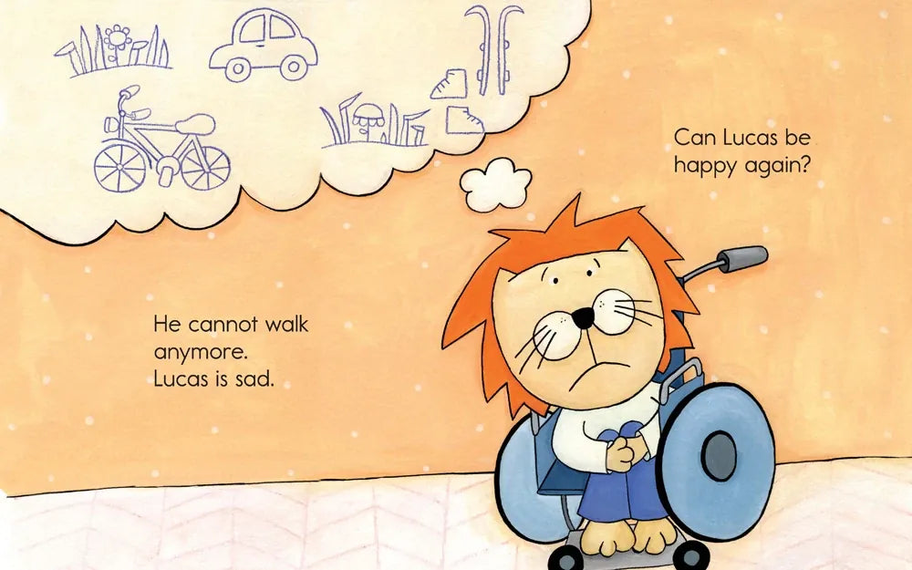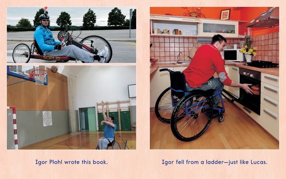 When Lucas falls off a ladder, he hurts his spine and can't use his legs anymore. He can't stand on them and he can't walk on them. Through self-determination and with the love of friends and family, Lucas learns new ways to take care of himself and have fun.