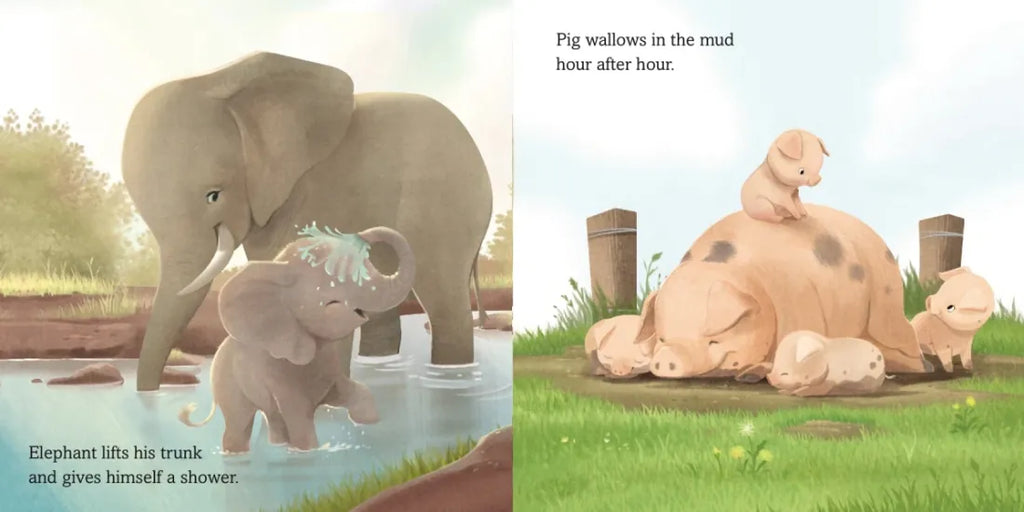 Follow elephants, pigs, monkeys, hippos, and more in this charming rhyming picture book by Kate McMullan, filled with Sydney Hanson's adorable illustrations that toggle neatly between animals in nature grooming themselves and humorous depictions of children attempting the animals' bathing tactics.