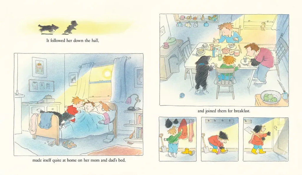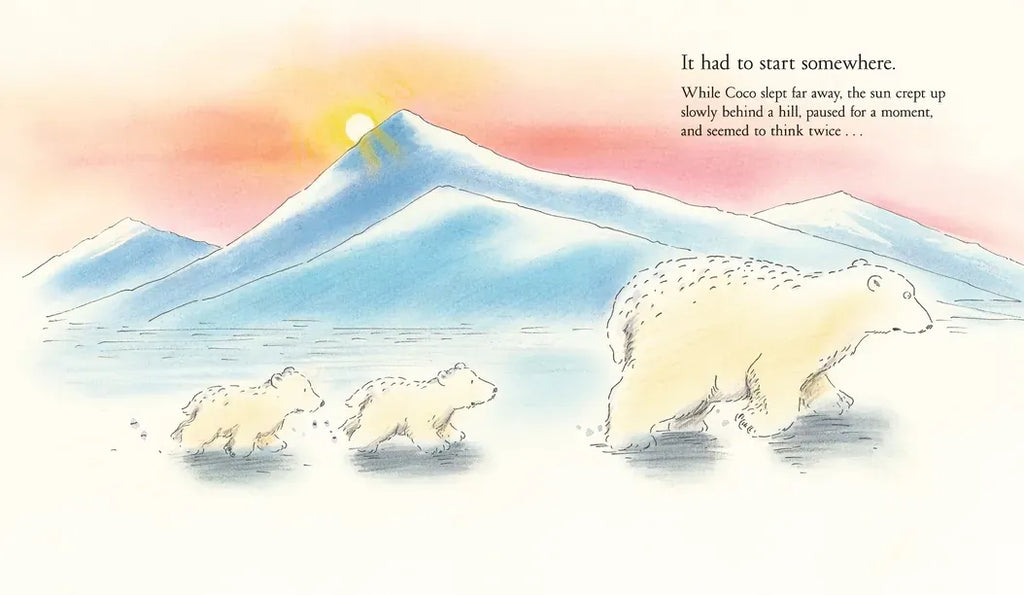 While Coco sleeps far away, the sun creeps over a hill and skids across the water, touching a fisherman’s cap. It heads out over frozen forests, making shadows in a child’s footprints, and balances on an airplane’s wing for a little boy to see. The sun crosses cities and countrysides, wakes furry creatures, makes a desert rainbow, and barges into Coco’s room to follow her through a day of play. With an eye for capturing small moments of shared experience, Bob Graham illuminates the natural wonder that comes with every new day.