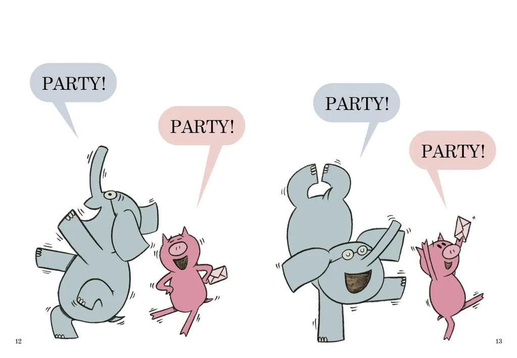 In I Am Invited to a Party! Piggie is invited to her first party. She doesn't know what to wear, though, so she asks her best friend Elephant for help. Elephant's advice is odd to say the least, so Piggie will try on all sorts of zany outfits before finally arriving at the party for a hilarious surprise.