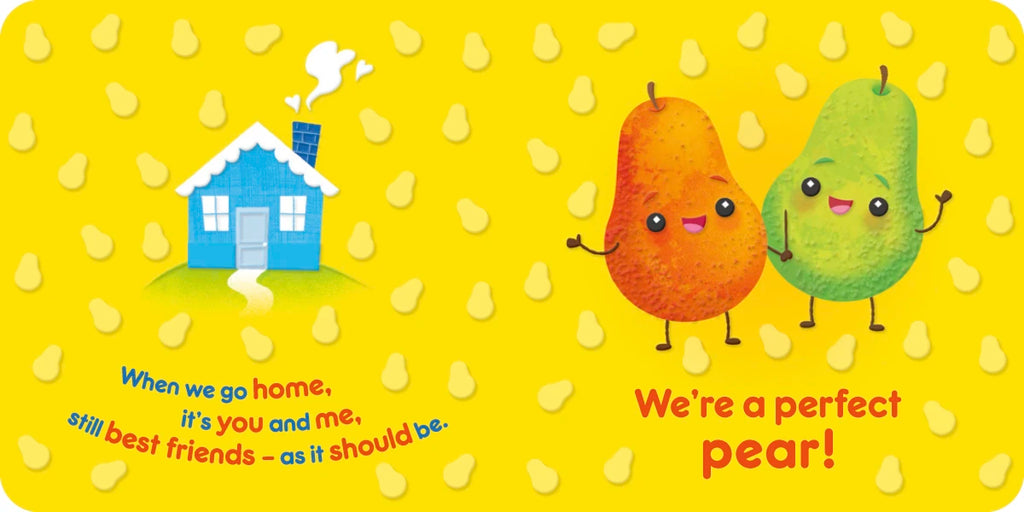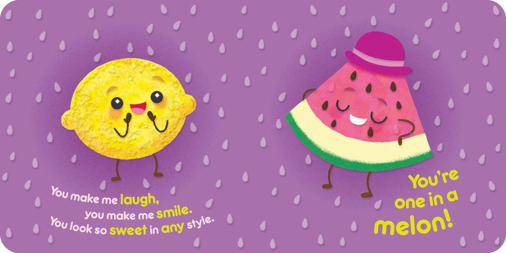 Sweet rhymes of friendship pair with colorful, adorable artwork and tactile textures throughout for the perfect treat! Children can touch the embossing on each spread for an interactive reading experience. Cute play-on words, such as "We're a perfect pear!," “You’re one in a melon!,” “Muffin compares to you!,” “I’m your biggest flan!,” and “I love you a waffle lot!” will appeal to young readers as well as adults. Ideal for sharing with a special little one.