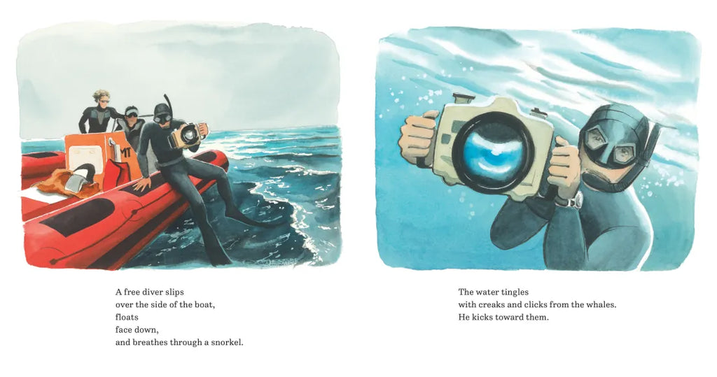 Told from the vantage point of Belgian freediver Fred Buyle, who with his diving partner Kurt Amsler are the only people known to be present at the birth of a sperm whale, In the World of Whales features lyrical-yet-precise text by Michelle Cusolito and dreamlike illustrations by Jessica Lanan, creator of the Sibert Honor book Jumper: A Day in the Life of a Backyard Jumping Spider. Any child who dreams of speaking to animals will adore this proof of humanity’s bond with the wild world. At the end of the story, find more information about freediving and whales.