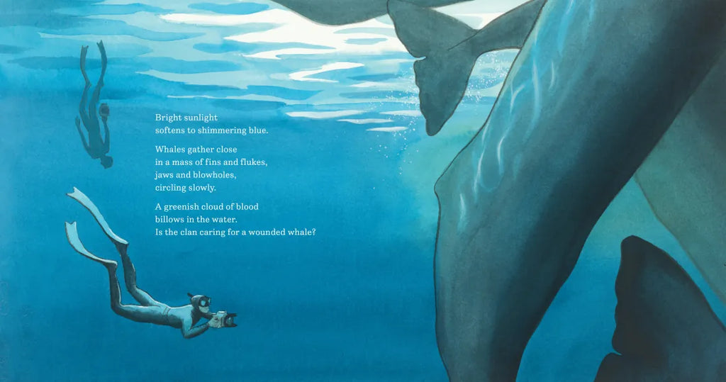When a freediver (one who dives without the benefit of oxygen) slips underwater, he encounters a pod of sperm whales so close he can almost touch them. When he sees blood in the water, he wonders if there's been an injury. When he comes even closer, what he finds instead is a moments-old calf, skin wrinkly and tail fluke still folded from the womb.