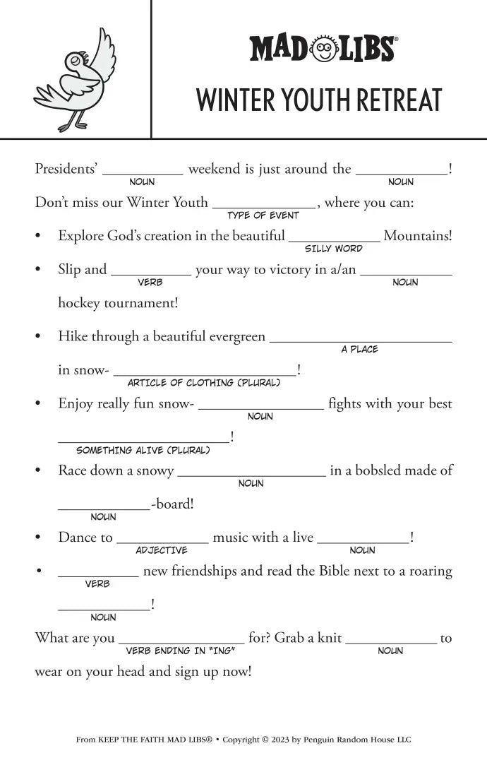 Explore God's creation in the SILLY WORD Mountains! With 21 “fill-in-the-blank” stories about winter youth retreats, Lent, Easter, and church activities, Keep the Faith Mad Libs is the perfect activity for any young Christian! Play alone, in a group, or at Sunday school! Mad Libs are a fun family activity recommended for ages 8 to NUMBER.