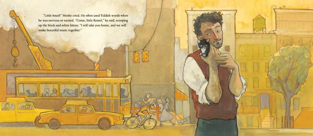 Moshe Cotel was a composer who lived in a noisy building on a noisy street in a noisy city. But Moshe didn’t mind. Everything he heard was music to his ears. One day, while out for a walk, he heard a small, sad sound that he’d never heard before. It was a tiny kitten! “Come on, little Ketzel,” Moshe said, “I will take you home and we will make beautiful music together.” And they did—in a most surprising way. Inspired by a true story, Lesléa Newman and Amy June Bates craft an engaging tale of a creative man and the beloved cat who brings unexpected sweet notes his way.