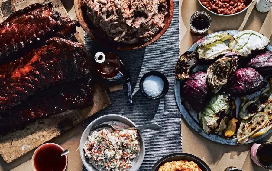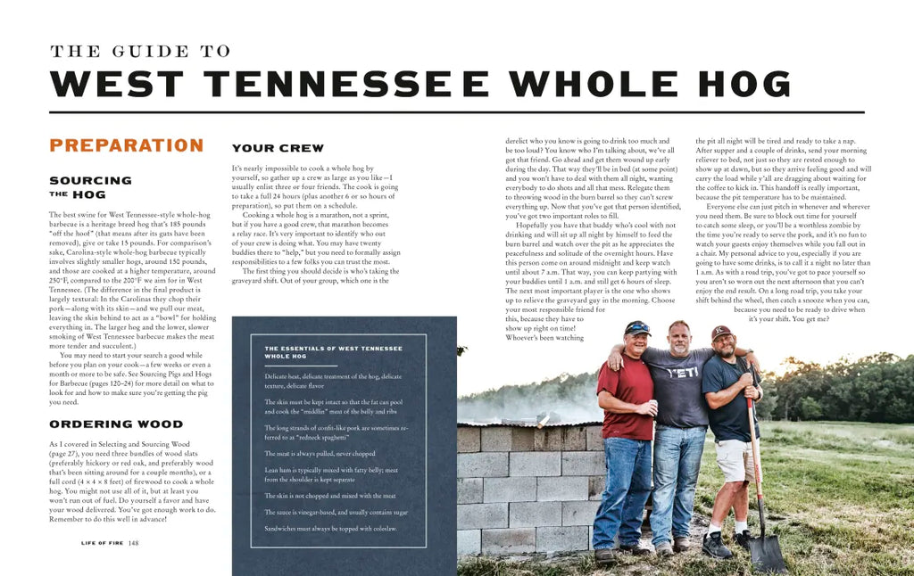 Through beautiful photography and detailed instruction, the lessons start with how to prepare and feed a fire—what wood to use, how to build a pit or a grill, how to position it to account for the weather—then move into cooking through all the stages of that fire’s life. You’ll sear tomatoes for sandwiches and infuse creamed corn with the flavor of char from the temperamental, adolescent fire. Next, you’ll grill chicken with Alabama white sauce over the grown-up fire, and, of course, you’ll master pit-cooked whole hog, barbecue ribs, turkey, pork belly, and pork shoulder over the smoldering heat of mature coals. Finally, you’ll roast vegetables buried in white ash, and you’ll smoke bacon and country hams in the dying embers of the winter fire.