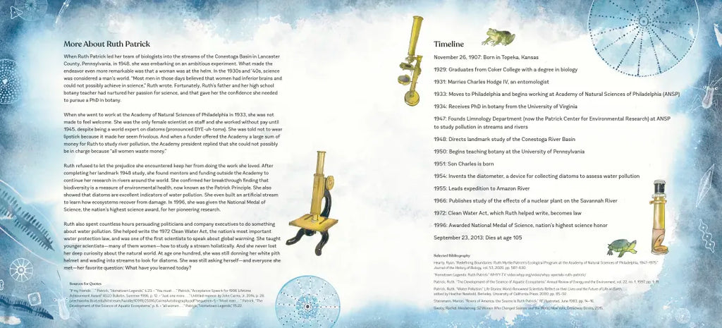 A brilliant scientist and intrepid explorer, the ecologist Ruth Patrick taught the world how to care for the environment. She studied water pollution long before it became a public concern and gave other scientists the tools to do something about it. Born in 1907, Ruth Patrick was one of the only women in her field when she made her breakthrough discovery about biodiversity and the ecosystem of rivers, forever changing how ecologists understand pollution.