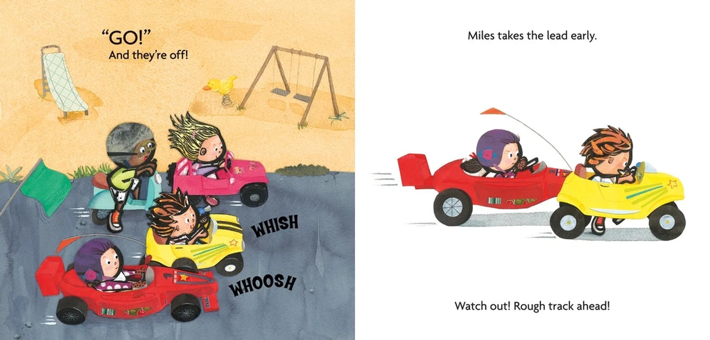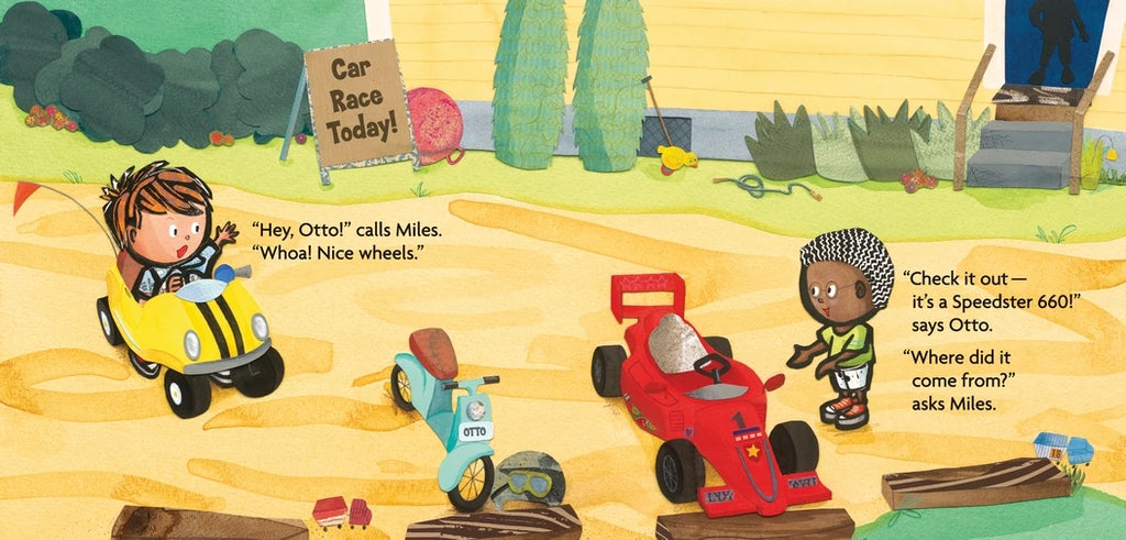 It’s race day at the Red Apple School, and Miles and Otto can’t wait. But what’s that fancy Speedster doing here? It belongs to a girl named Indie, and the boys had better get in shape if they want to win the trophy! Soon everyone is off — whish! whoosh! — and Miles takes an early lead. But then Indie is at his side, only to go off the track. Will Miles take his chance for an easy win? Young children will bubble with excitement as they follow the adorable, foot-powered race — and smile at the satisfying ending.