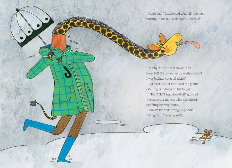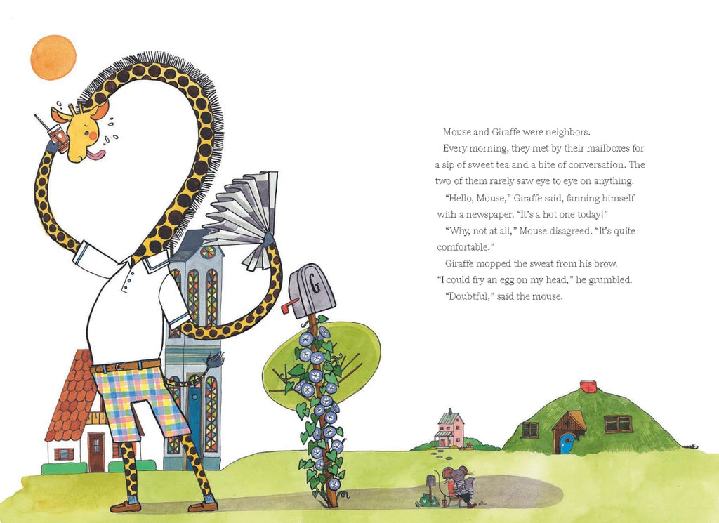 They live on the same street, but their experiences couldn't be more different. On sunny days, Mouse is comfortable in the shade, while Giraffe is so tall, he overheats in the sun. On rainy days, Giraffe is dry above the clouds, while Mouse gets stuck in the storm. What will it take for Mouse and Giraffe to learn that perspective is all about walking in someone else's shoes?