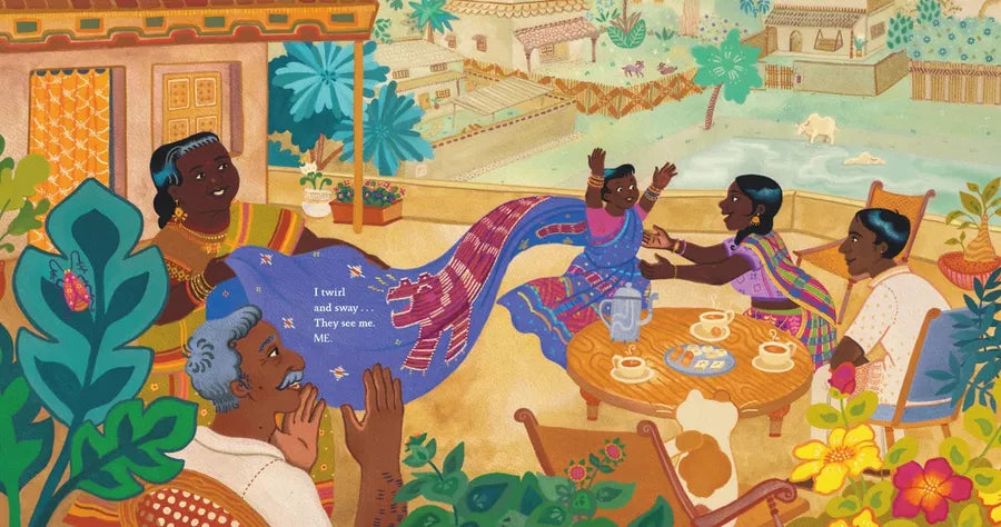 Through it all the boy finds comfort in Paati’s sari, whether he’s wrapped in its colors for dress-up or clutching its folds for comfort. Each sari holds a story—ones that speak to him, but most important of all they allow him just to be.