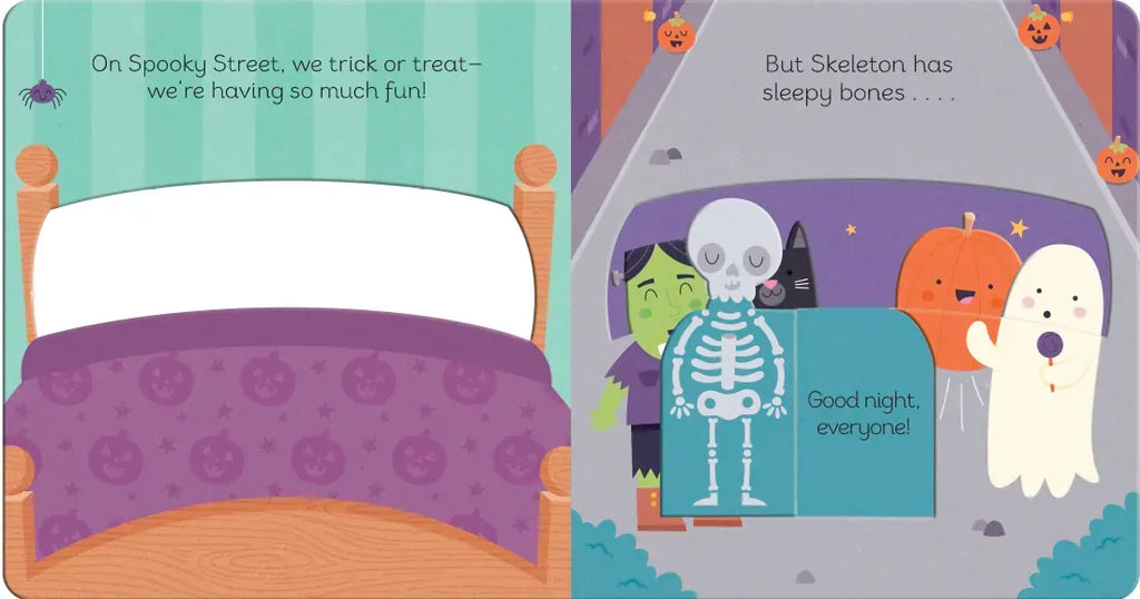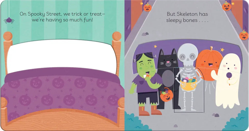 It's Halloween night, and it's time for an evening full of trick-or-treating and fun! A group of spooky friends has gone around to collect candy on this fun night, but now they're tired and ready to go to bed! Young readers can follow along as Skeleton, Ghost, Pumpkin, and more adorable characters head home and jump in bed one by one. This fun book features sturdy flaps for little hands, and a clever transformation with each turn of the page!