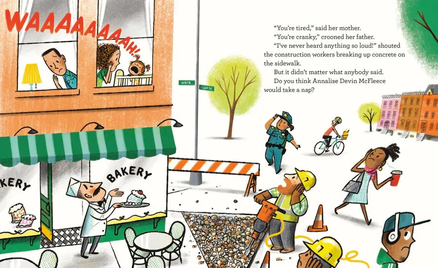 It's time for a nap but, just like stubborn toddlers everywhere, Annalise Devin McFleece won't have anything to do with bedtime. Dad tries to encourage sleepiness by pushing her around the park in her stroller. Along the way, they pass a man sitting on a bench, dog walkers walking dogs, a boy on a skateboard, kids playing ball, a girl practicing her juggling, and others. Each of them thinks that taking a nap is a great idea and if Annalise Devin McFleece doesn't want hers, they'll happy take it. And one by one, everyone falls asleep...except Annalise Devin McFleece. But when she's finally ready for her nap, all the naps are taken! Is there anyone who has an extra nap to spare?