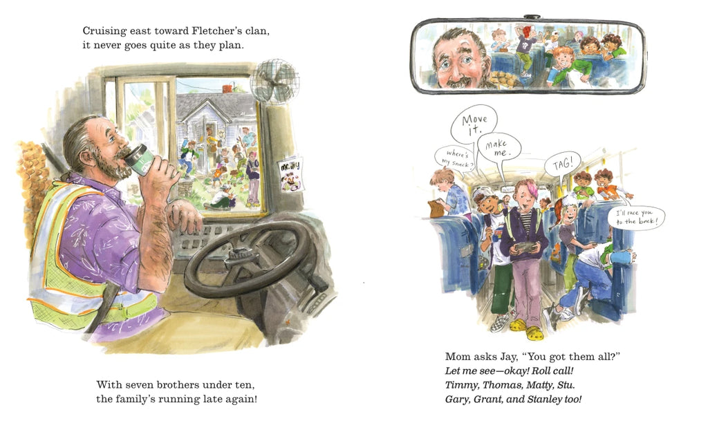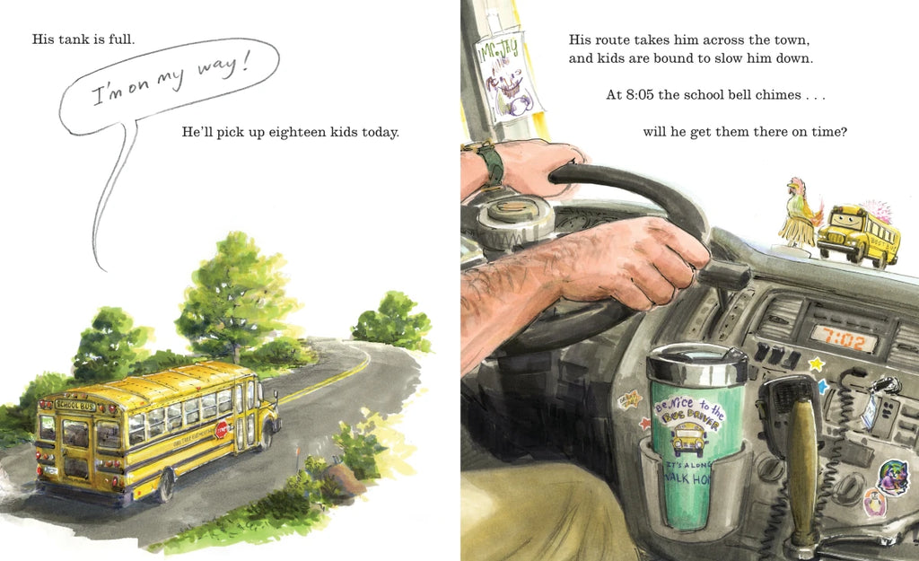 With the clock ticking all the while, Mr. Jay picks up kids from all over town—out in the country, up a hill, in the busy city, always piloting his bus with jaunty rhymes and a can-do attitude. Along the route, he’s called upon to settle stomachs, clean up pony poo, and fix a diorama. He avoids a stampede, settles down an intruding dog, and even fights off hostile swans! But will he get the kids to school on time?
