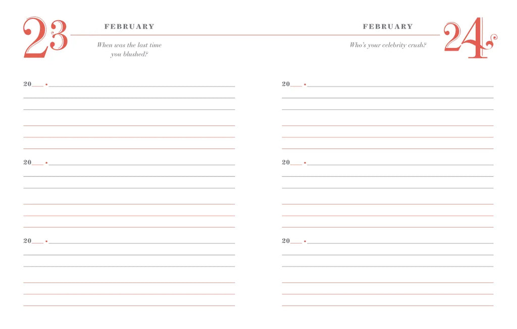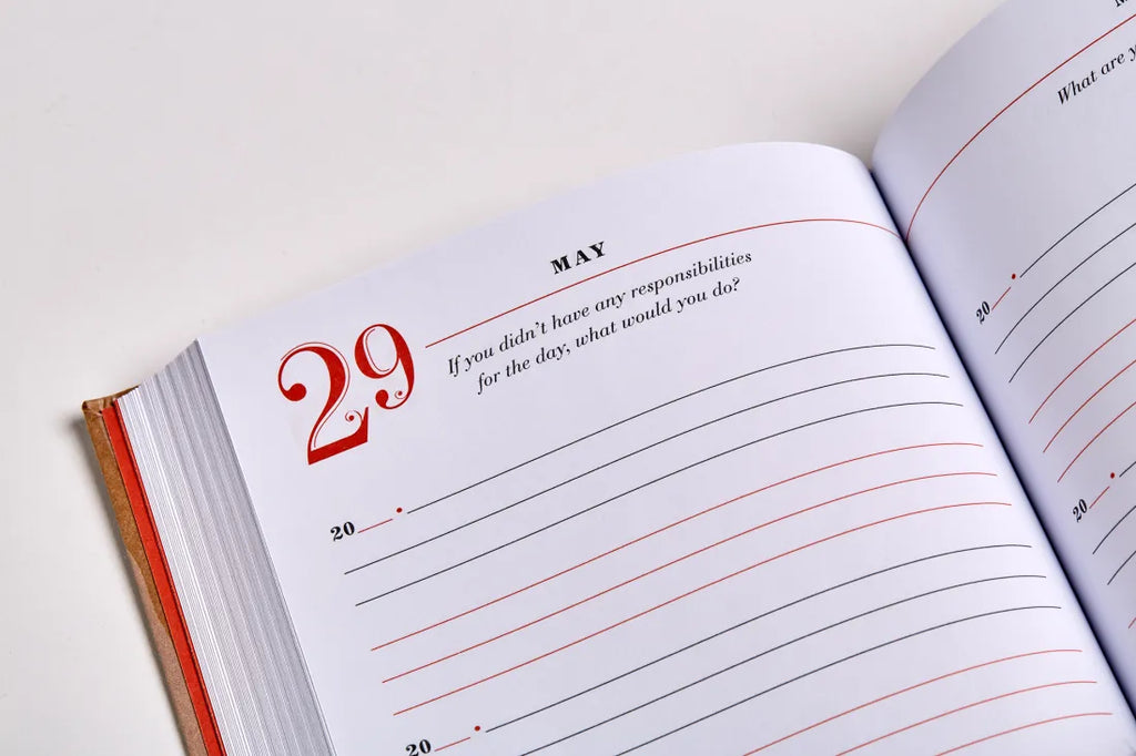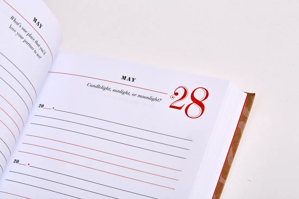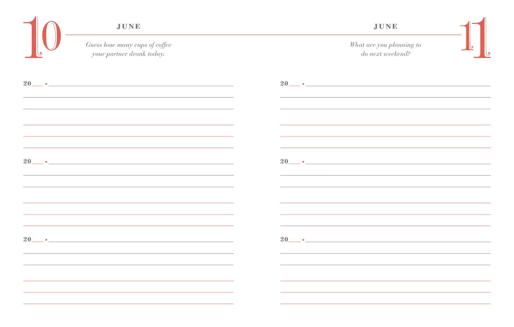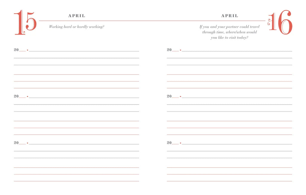 Our Q&A a Day provides a question for every day of the year, with enough space for two people to jot down a one- or two-sentence response. The journal offers a variety of questions; some may address the relationship ("Where would you like to travel with your partner?"); others suggest writing something about each other ("What does your partner's laugh sound like?"); many are simply questions that each person answers individually ("What is your top priority today?").