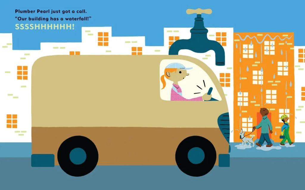 Plumber Pearl comes in to fix their overflowing sinks, toilets, bathtubs, and pipes one floor at a time! Each floor has a problem that needs to be solved with her skills and tools. But where is this waterfall coming from?! Plumber Pearl is determined to find out with the help of squeaky mice and fun onomatopoeia on the way. The CHUG-A-GLUG of the pump and TWEEEEEAK of the wrench will have toddlers giggling.