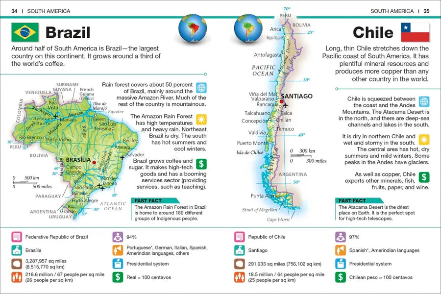This country guide is divided into continental chapters, featuring each nation's geography, climate, and economics, supplemented by stats and data. Children will learn the national flags, official names, capital cities, populations, total area, population density, languages, literacy rate, type of government, and currency, all meticulously researched from the latest sources.