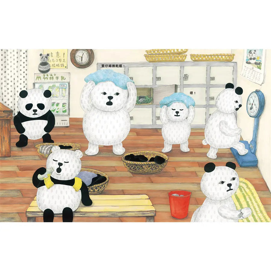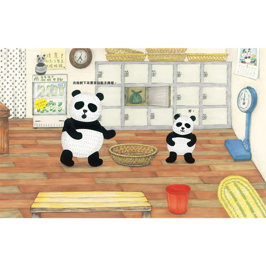 夜晚,貓熊一家三口來到澡堂,入口的櫃檯上貼著這樣一張告示: