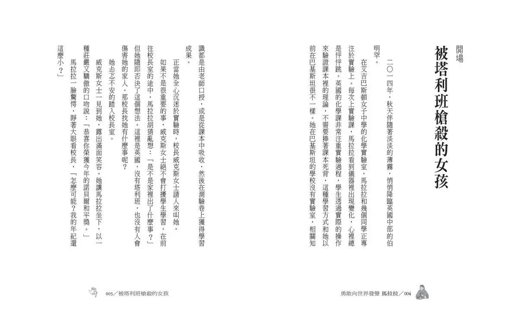 二○一二年,塔利班朝我開槍,射殺我的朋友。他們以為子彈會讓我沉默,但他們失敗了,因為在短暫的沉默之後,響起了成千上萬的聲音。恐怖分子以為能夠改變我的目標,阻止我的理想,但我的生活並沒有改變,除了已逝去的「懦弱、恐懼和無助」,「堅定、勇氣與力量」卻同時誕生了。我還是同一個馬拉拉,我的理想依舊,我的希望亦如故,我的夢想依然不變。