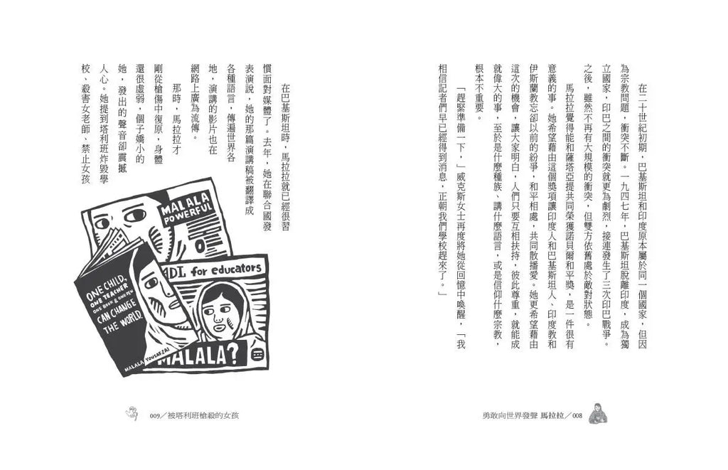馬拉拉追隨父親宣揚教育的重要性,特別是女孩子的受教權,即使生命遭遇威脅,命在垂危,也沒有停下腳步。她以穿透人心的語言,引發世界關注;以無比的堅強與勇氣,捍衛女孩的受教權,並為世界上失學的孩童勇敢發聲!