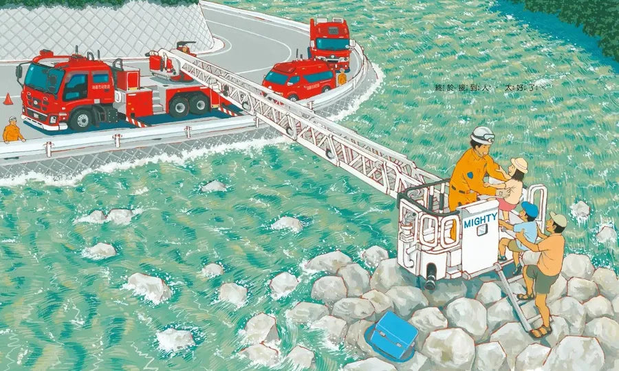 一次認識四種大小不同、任務不同的消防車——雲梯車、幫浦車、水庫車和指揮車,透過故事認識這些消防車的用途。
