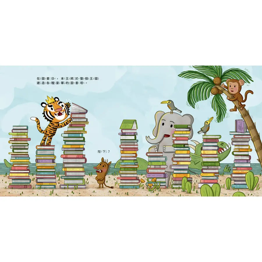 愛書的老虎國王宣布——今天是圖書日!他興奮的用書本堆疊成一座又一座的書塔、製造圖書大地震,甚至把書當成托盤來端湯喝⋯⋯但是,國王真的知道書的真正用途嗎?直到護城河怪物來襲,他才終於聽進忠臣的話:「書,是用來讀的喔!」翻開書頁,國王終於真正領略了書本的意義。